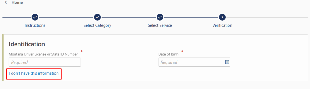 En nuestro caso carecemos de Licencia o ID Card en Montana. asique marcamos la opcion que señalamos y pulsamos Next.